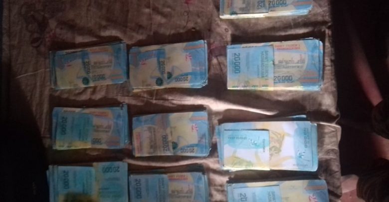 Vola sandoka mitentina 9 800 000 Ar no sarona ka ravim-bola roa alina daholo izany. Araka ny fanadihadiana natao tany an-toerana,  fantatra fa ny vadin’ilay vehivavy, no nitondra sy nametraka ireo vola sandoka tao an-tranon’izy mivady. Nitsoaka izy mivady, raha vao nahare ny fahatongavan’ireo zandary. Mikasika ilay lehilahy tompon’antoka dia 40 taona teraka tao Vohidamba, kaominina Betampona, distrikan’i Marolambo. Fantatra fa mpividy volamena, monina ao Ankolokala II, fokontany Andambinana, kaominina Sahakevo, distrikan’i Marolambo izy io. Momba ny vadiny indray, vehivavy mpamboly 25 taona  monina ao Andranovakoana, fokontany Ambodinonoka, distrikan’i Marokambo. Mitohy ny fikarohana azy mivady sy izay mpiray tsikombakomba aminy, Nogiazana ireo vola sandoka tratra ireo ary.  nampandrenesina ny sampandraharaha ny Banky Foibe sy ny Fitsarana. Ny tobim-paritry ny zandarimaria Marolambo no misahana ny fanadihadiana.