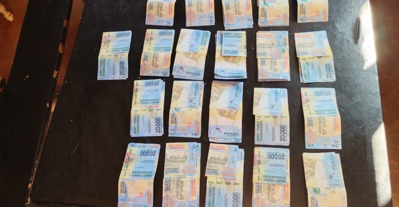 Teo vao nikoropaka, ka navory avokoa ny vola rehetra mitentina 2.100.000 Ar, izay hita fa sandoka avokoa afa-tsy 20.000 Ar tokana. Izany hoe, ireo heverina fa volabe mitentina 2.080.000 Ar dia sandoka avokoa, izay mitondra laharana samihafa. Natao ny fikarohana ireo nanaparitaka ny vola sandoka ka  R. Jean Claude/Clô ihany no tratra fa i Haja kosa, nandositra niaraka tamin’ny môtô sy  ny taratasy momba azy. Môtô cross marika Mak 150CC miloko fotsy sy mainty izy io. Mitohy, araka izany,  ny fikarohana ary notazomina natao andrimaso i Clô sy ny vola sandoka naparitak’izy ireo. Hatolotra ny Fampanoavana ity lehilahy sarona nanapariaka vola sandoka ity, aorian’ny famotorana.