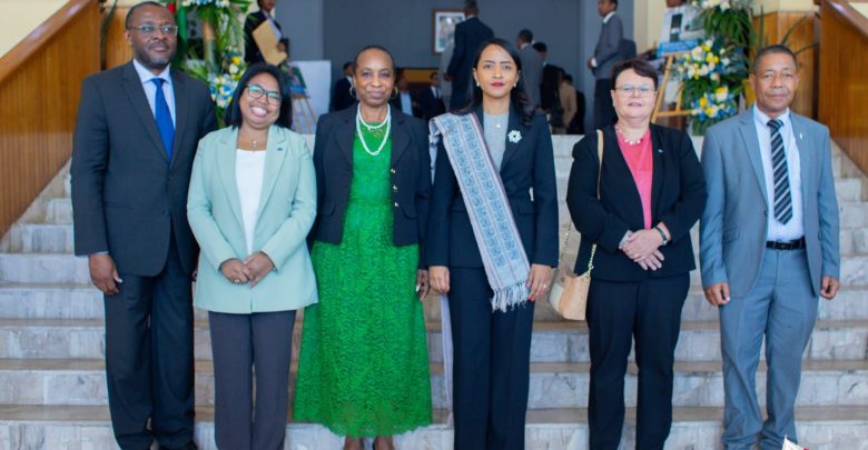 Marihina fa mitarika ny delegasion’ny ONUDI eto Madagasikara moa ankehitriny ny Tale Lefitry ny ONUDI, Ramatoa Fatou Haidara, sy ny Solontena maharitry ny ONUDI eto Madagasikara, Ramatoa Volatiana Rakotondrazafy.