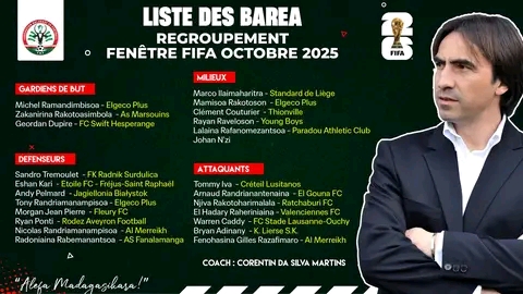 Nivoaka ny lisitry ny Barea an’i Madagasikara hiatrika ny andro faha-9 sy faha-10 eo amin’ny fifanintsanan’ny amboara erantany 2026. Nanamarika ity lisitra navoakan’ny mpanazatra Corentin Da Silva Martins ity ny fidiran’ireo mpilalao mbola tanora hanampy ireo zoky efa manana rraikefa.
