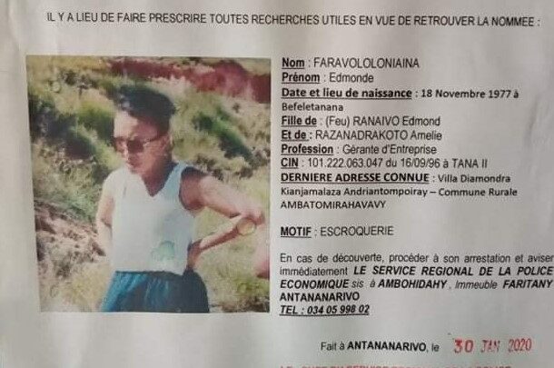 Tra-tehaka tany Toamasina afakomaly, ilay Ramatoa antsoina hoe : Faravoloniaina Edmonde nokarohin’ny Polisy ekonomika fatratra. Efa namoahana didy fikarohana mihitsy izy, nanomboka ny 30 janoary 2020, ka izao vao voasambotra. Fisolokiana sy fivadiham-pitokisana no fiampangana an’ity Ramatoa mpisoloky gagivavy ity. Nipetraka tao amin’ny Villa Diamondra, Kianjamalaza Andriantompoiray, Kaominina ambanivohitra Ambatomirahavavy, no nahitana azy farany. Nambaran’ireo fianakaviana lasibatra tamin’ity fisolokiana sy fivadiham-pitokisana nataon’ity olona ity, fa niditra tao amina hotely iray tany Toamasina izy afakomaly io no hitan’izy ire. Avy hatrany dia niantsoana polisy tao an-toerana. Amin’ity anio ity, ilay mpisoloky no hiakatra eto Antananarivo hanaovana fanadihadiana. Fivarotana tany mirefy 63 Ara 00 Ca amin’ny « titre N° 2532 » atao hoe Vohimasina Ambatomirahavavy no nanaovan’ilay mpisoloky asa fisolokiana sy fanaovana hosoka sy fampiasana hosoka.