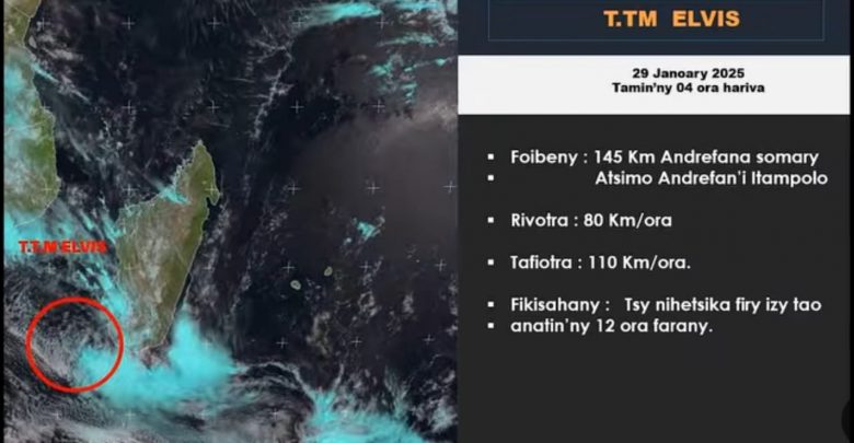 Raha ny fampitam-baovao voaray teo anivon’ny Foibe famantarana ny toetry ny andro, omaly tamin’ny 03 ora maraina, dia nitombo hery ka lasa rivodoza ary nomena ny anarana hoe « ELVIS » ilay andro ratsy niforona tao amin’ny lakandranon’i Mozambika. Tany amin’ny manodidina ny 140 Km andrefana somary atsimo andrefan’Itampolo Distrikan’Ampanihy no nisy ny foibeny. 65 Km/ora ny rivotra miaraka aminy tamin’izay, narahina tafiotra 90 Km/ora manakaiky ny foibeny. Nikisaka nianatsimo andrefana izy ka nahafaka 07 Km/ora. Omaly tamin’ny 09 ora maraina kosa, dia tany amin’ny manodidina ny 142 Km andrefana somary atsimo andrefan’Itampolo Distrikan’Ampanihy no nisy ny foiben’i ELVIS. 65 Km/ora ny rivotra niaraka taminy, ary narahina tafiotra 90 Km/ora manakaiky ny foibeny. Omaly tamin’ny 03 ora tolakandro kosa, fampitam-baovao voaray farany, dia tany amin’ny manodidina ny 145 Km andrefana somary atsimo andrefan’Itampolo Distrikan’Ampanihy no nisy ny foiben’ity rivodoza ity. Niakatra ho 80 Km/ora ny rivotra miaraka aminy, arahina tafiotra 110 Km/ora manakaiky ny foibeny. Tsy nihetsika firy izy tao anatin’ny 12 ora farany. Marihina fa any an-dranomasina no ahitana ny rivotra mafy miaraka amin’ity rivodoza ity. Na izany aza, tombanana hihena miandalana ny rotsak’orana entiny any amin’ny tapany andrefana sy atsimon’ny Nosy manomboka anio alina. Tsy misy kosa ny filazana loza mahakasika voarain’ireo Faritra sy distrika mahakasika azy, afa-tsy ireo mpampiasa ranomasina eo anelanelan’i Morombe sy Taolagnaro, mba tsy hiandriaka mandrapahalasan’ny loza, noho ny fikorontanan’ny toetry ny andro.