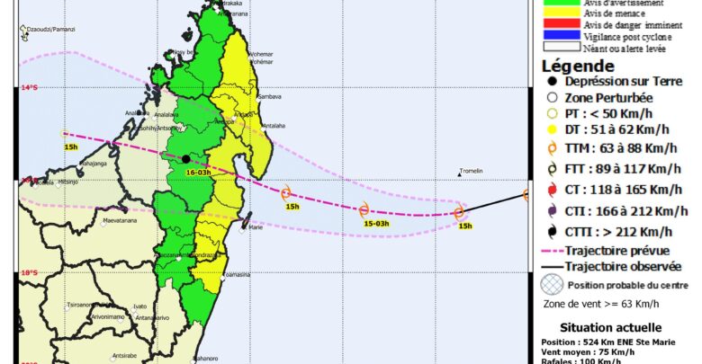 Eo anatrehan’izany, mihatra ny filazana loza manambana miloko mavo ho an’ny Faritra Sava sy Analanjirofo, ary ny Distrikan’i Toamasina I-II. Filazana fanairana miloko maitso kosa no azon’ny Faritra Diana, ny Distrikan’i Bealanana, Befandriana Avaratra, Mandritsara, Andilamena, Amparafaravola, Ambatondrazaka, Brickaville. “Ny mpampiasa ranomasina eo anelanelan’i Brickaville sy Vohémar dia entanina mba tsy hiandriaka intsony satria hiharatsy ny toetry ny andro”, araka ny tatitra hatrany.