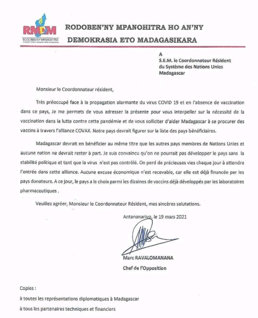 Filàm-boatsiary. Io no azo hamaritana ny fihetsiky ny mpanohitra eo anatrehan’ny Vaksiny Covid-19 ankehitriny. Raha tsiahivina mantsy dia, ny rodoben’ny mpanohitra ho an’ny demokrasia eto Madagascara na RMDM sy ny filoha teo aloha Marc Ravalomanana no isan’ireo nitaky voalohany ny hidiran’i Madagasikara anatin’ny initiative Covax eto amintsika. Ny 19 Martsa 2021 dia nandefa taratasy ho an’ny mpandrindra maharitry ny ny asan’ny firenena mikambana eto Madagasikara izy ireo. “Raisiko ho voninahitra ny manoratra ity ho anao” hoy Marc Ravalomanana tao anatin’io taratasy io “mba hanaitra anao ny amin’ny tokony hisian’ny fanaovam-baksiny amin’ny ady atao amin’ity valan’aretina ity, sy ny hangataka ny fanampianao an’i Madagasikara hahazo ny vaksiny amin’ny alalan’ny alliance Covax ». Fangatahana izay nohamafisin’ny fanambaran’ny RMDM ny 30 martsa 2021, ary ataon-dry Me Hanitra Razafimanantsoa sy Fidele Razara Piera ambetin-dresaky ny fandaharana “Miara-manonja” saiky isan’andro. Fantatr’izy ireo tsara anefa fa ny “AstraZenaca” izay vokarina any Inde ary mitondra ny anarana hoe “Covishield” ihany no omen’ny mécanisme Covax na aiza na aiza.